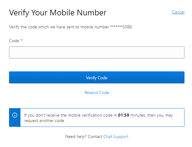나는 경기도 화성시 남양읍에 위치한 아파트에 거주중이다. 오라클은 외국계 회사이니 친절히 영문 주소로 기입을 하도록 하자. 실제 사용중인 휴대폰 번호의 맨 앞 숫자 0을 제외한 나머지 번호()를 입력하고 최 하단에 Next: Verify Mobile Number 버튼을 클릭하여 다음으로 넘어 가자.