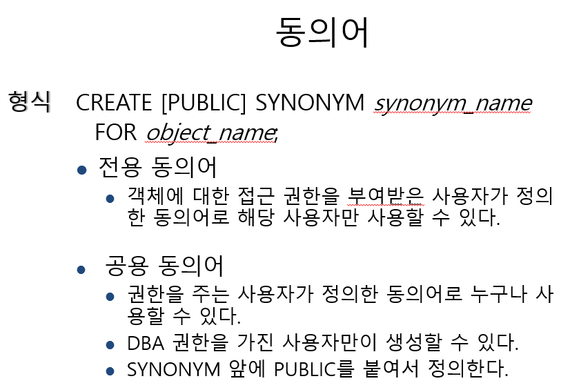 2. 공용(public synonym) -> 관리자만이 만드는 경우, 모든 계정들이 사용할 수 있는 동의어를 만드는 경우