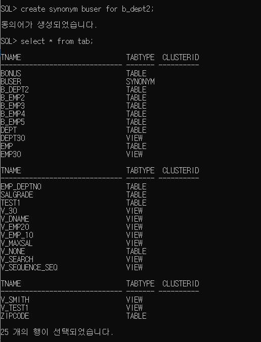 select * from tab; // 테이블의 별칭 (=동의어), (Synonym(시노님, 동의어))의 개요, 사용-> 사용권한 -> 단어는 다르지만 의미가 같은것(별칭, 별명(사람))