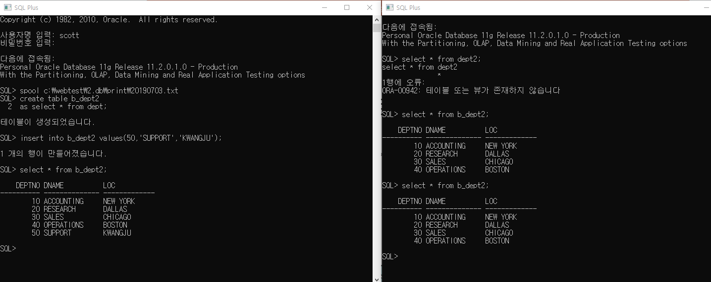 SQL> insert into b_dept2 values(50,'SUPPORT','KWANGJU');