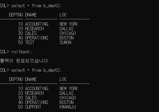 SQL> insert into b_dept2 values(60,'TESTING','SEOUL');