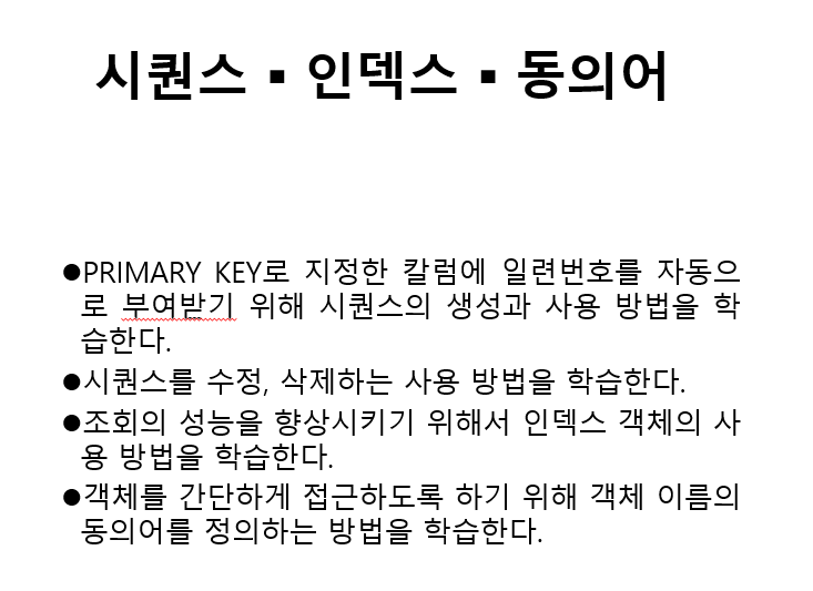 현재까지 오라클의 테이블, 뷰,트랜잭션을 기록하였다. 오라클의 2/3는 대략 저장하였다고 봐도 무방하다. 아닐수도있다 오라클은 광범위 하기때문에 하지만 내가 필요한 오라클의 정보의 2/3는 모두 기록하였다고 봐도 괜찮을것같다는 의미이다. 이제 남은건, **인덱스, 시컨스**, 동의어(synonym)이 남아있는 상태이다.
