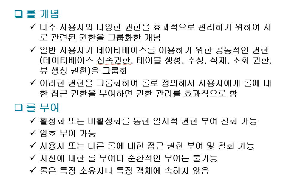 사용 목적으로는 롤을 이용하여 한꺼번에 많은 권한을 편리하게 부여하기 위해서 만든 것이다.