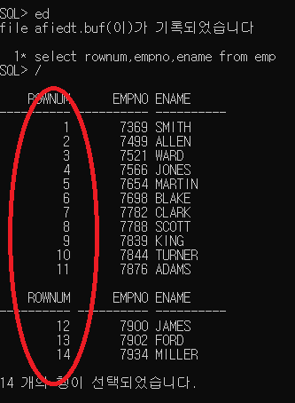 1* select rownum empno,ename from emp // empno를 rownum의 별칭 형태로 사용하였다.