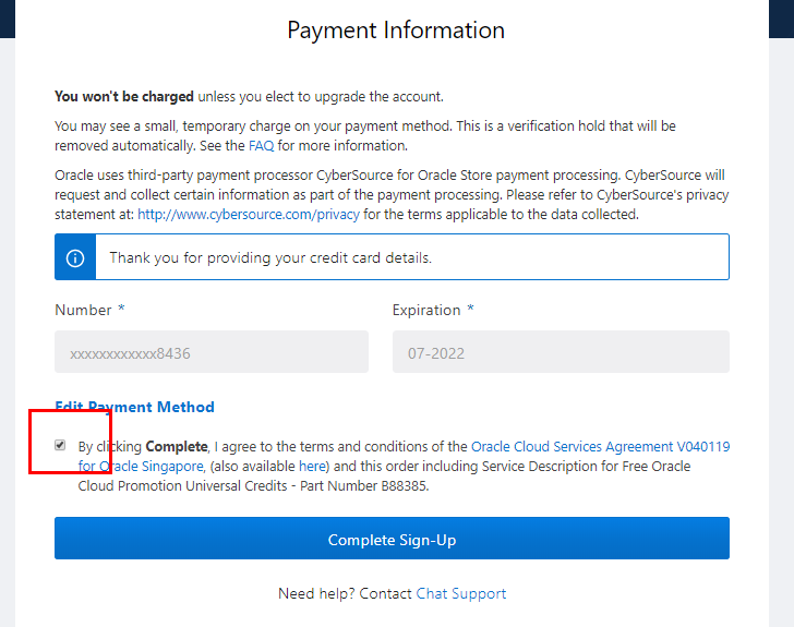 다시한번 결제 정보에 대한 안내문(계정과 서비스 업그레이드를 하지않으면 요금 청구가 되지않는다.) 을 한번 더 확인 시켜 준다. 우리는 오라클을 믿고 Complete Sign-Up 버튼을 클릭하면 된다. 이제 결제 정보가 등록이 되고 회원 가입이 완료 된다.