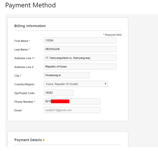 회원 가입 시작 부분에 입력한 정보를 기반으로 자동으로 입력이 되어있으며, 우리는 하단 카드 정보만 입력을 해주면 된다.