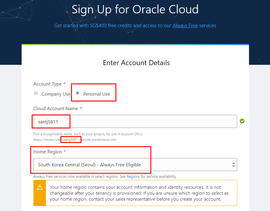나는 개인 용도로 오라클 클라우드 서비스를 사용하려 하는것이기에 Personal Use에 체크를 하였고, Cloud Account Name의 경우 나의 닉네임 또는 프로젝트 명으로 지어주는것이 좋다. 추후 클라우드 서비스 로그인 아이디로 사용이 될 정보이다. Home Region의 경우 실제 클라우드 서버가 위치할 지역을 선택하는것이다. Region은 내가 서비스하려하는 지역과 물리적으로 가장 가까운 나라로 선택하여야 서비스 속도와 네트워크의 안정성이 보장된다. 나는 한국에서 서비스를 운영 할것이기에 South Korea Central (Seoul)로 선택을 하였고 지역명 옆에 붙어있는 - Always Free Eligible 가 붙어있는 지역으로 선택을 해야만 평생 무료 클라우드 컴퓨팅 서비스를 이용할 수가 있으니 참고하길 바란다.