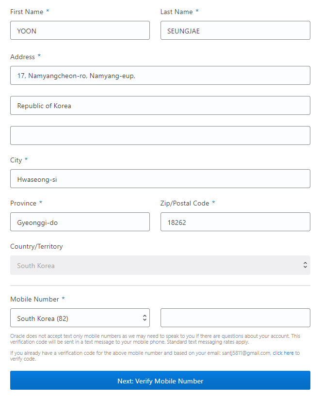 나는 경기도 화성시 남양읍에 위치한 아파트에 거주중이다. 오라클은 외국계 회사이니 친절히 영문 주소로 기입을 하도록 하자. 실제 사용중인 휴대폰 번호의 맨 앞 숫자 0을 제외한 나머지 번호()를 입력하고 최 하단에 Next: Verify Mobile Number 버튼을 클릭하여 다음으로 넘어 가자.