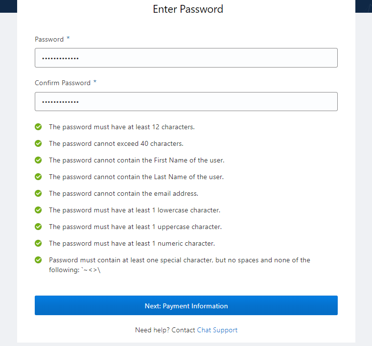 오라클 클라우드 서비스 로그인시 사용할 비밀번호를 입력해 준다. 아래 주의 사항을 확인하여 비밀번호를 생성 하도록 하자. 상단 이미지 처럼 초록색 체크 박스로 변경이 되었다면 이제 Next: Payment Information 버튼을 클릭하여 형식 적으로 결제 수단을 등록하여주자.