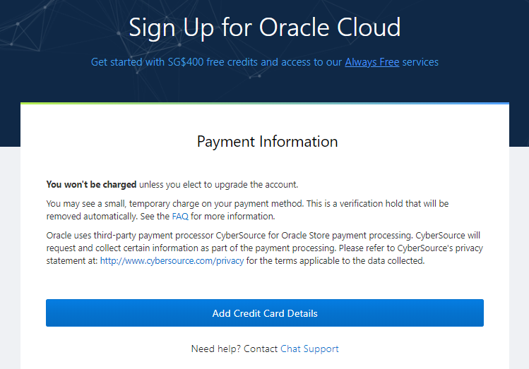 오라클 클라우드 서비스는 너무 좋은 부분이 Master 또는 Visa 체크 카드로 결제 정보를 등록 할 수 있다는 것이다. 학생과 신용카드 없는 사람들 모두 오라클 클라우드 서비스 사용에 대한 진입 장벽을 낮춘 것으로 확인이 된다. 체크 카드 또는 신용 카드 오른쪽 하단에 이미지에 있는 결제사 로고와 동일한 로고가 인쇄되어있으면 등록이 가능하다.