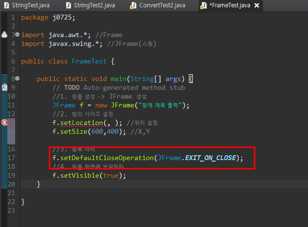 메인메소드에 해당 구문을 입력 Frame이라는 클래스의 데이터 타입을 가져와 f에 인스턴스화 시켜준다.
