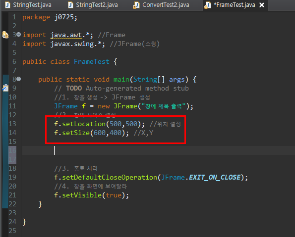 메인메소드에 해당 구문을 입력 Frame이라는 클래스의 데이터 타입을 가져와 f에 인스턴스화 시켜준다.