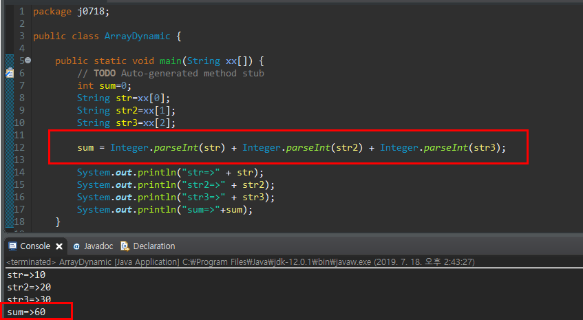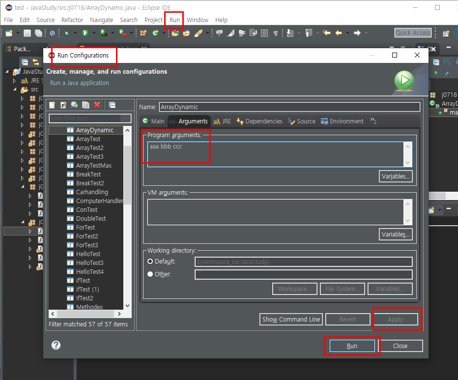 Program Arguments 상자 안에 입력 하고싶은 값을 띄어 쓰기를 구분으로 데이터 값을 순서에 맞게 입력해주면된다.