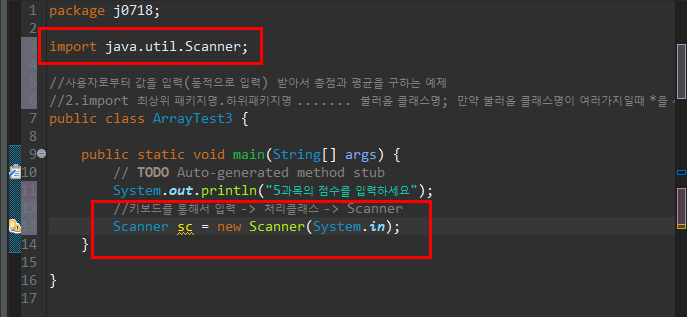 3. import 최상위패키지명.하위패키지명...불러올 클래스명으로 타 클래스를 상속받을수가있고, 만약 클래스가 너무 많을경우 * 로 모든 클래스를 불러올수도있다. 스캐너 클래스를 입력하였으면 import를 해야한다.
