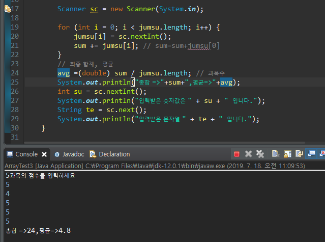 그리고 배열을 통해 사용자로부터 값을 입력(동적 입력) 받아서 총점과 평균을 구하는 예제를 한번 기록해 보자.
