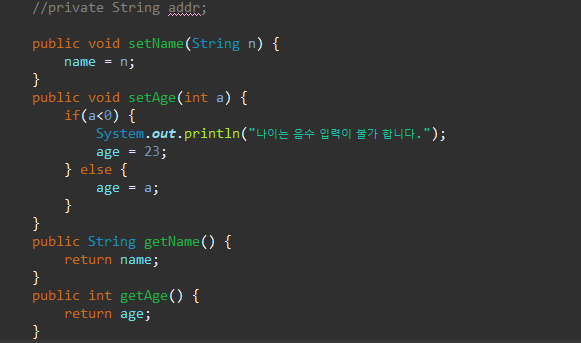캡슐화는 중간에 데이터를 수정할때 사용하게된다. 오라클로 비유를 하자면 update 테이블명 set 수정필드명 where 조건식 과비슷한 맥락이다. 캡슐화는 보통 "회원 정보" 수정할때 주로 사용 한다.