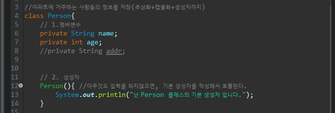 출력 구문을 통하여 Person이라는 생성자가 만들어지고 호출이 된다는 것을 확인할수가 있다. 즉 이러한 행위는 멤버변수의 초기화를 위해 사용되는것이다.