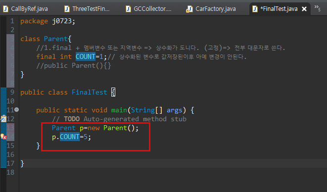 final + 멤버변수 또는 지역변수 => 상수화가 도니다. (고정)=> 전부 대문자로 쓴다.