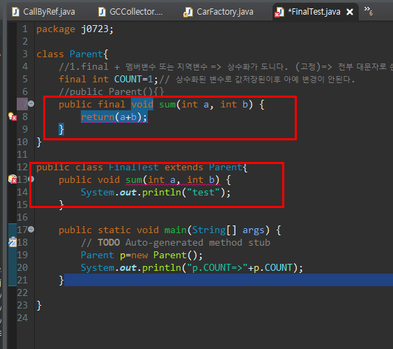 2. final 메소드명() -> 상속은 허용해주지만 오버라이드(=재정의)를 금지 해주고 싶은 메소드, 상속만 가능하다.