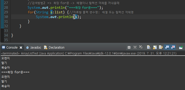 list에서 하나씩 꺼내서 s에 담아라 라는의미로 s에 각 인덱스별 데이터가 저장이 되어있는것이고. 출력시 위와같이 동일하게 출력이 된다.