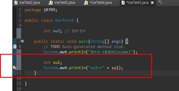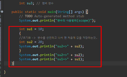 즉 변수 라는것은 아무곳에서나 사용할수가 없는것이다. 사용범위가 존재한다. 그리고 변수를 선언할때 변수의 값을 넣지않으면 오류가 발생한다.
