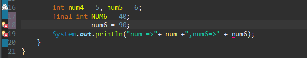 변수의 데이터 타입 앞에 final을 붙이니 오류가 발생하는것을 볼수있고, 상수의 변수는 관례적으로 소문자가 아닌 대문자 변수명을 사용하곤한다.