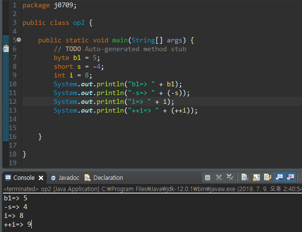 단항 산술 연산자로는 + - ++ -- 부호(양, 음수)가 있다. +3, -3 등