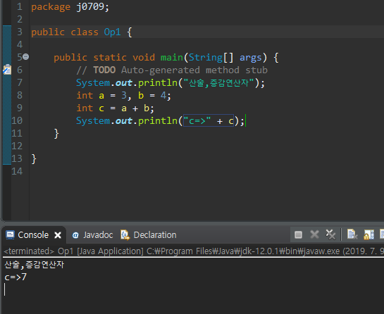 이항 산술 연산자로는 a+b, +,-,*,/,%(나머지) 가 있다. 상식적으로 그냥 산술할때 사용하는 연산자이다.