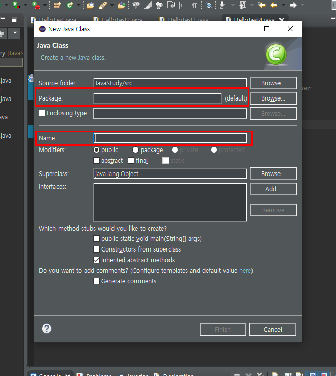 . . . . 점 하나로 해당 폴더로 순차적으로 들어간다고 생각하면 쉽다. 아무튼 생성할 해당 경로를 입력해주고, Name 부분에 파일명을 입력해주고, Public static void main(Sstring[] args)를 체크 해준뒤 Finish를 클릭해주면, 패키지(폴더) 생성과 파일 생성이 동시에 이루어지고