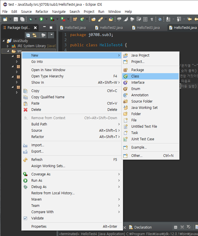 사진과 같이 src 폴더에 마우스 오른쪽 클릭 -> New -> Class를 클릭해준다. 이것은 클래스를 새로 만들것이다 라는 명령과 동일한 행위이다.