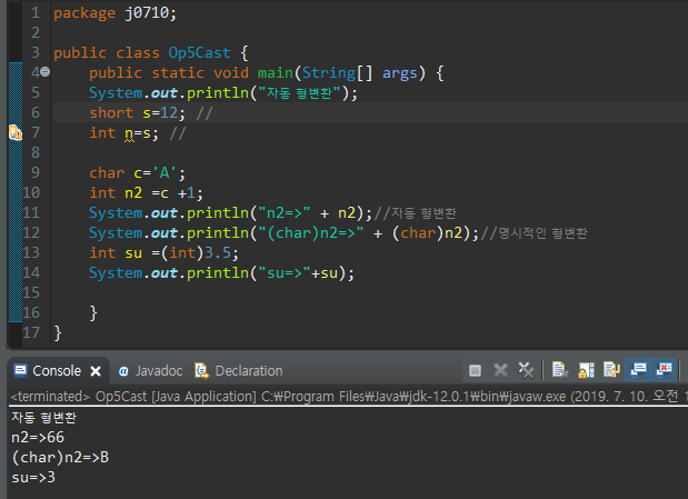 2) 계산중간에 자료형이 변환되는 것 또한 자동 형변환이다.