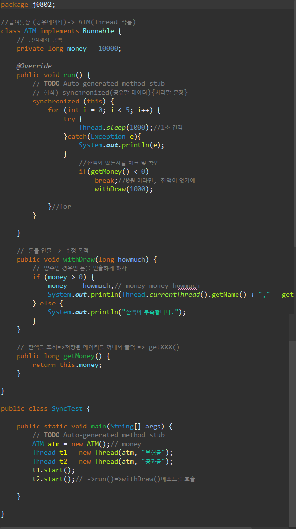 => 메소드 자체가 설정 => 메소드 종료할때 기다려준다. => 다른 쓰레드는 대기상태에 존재 => 락을 거는 개념